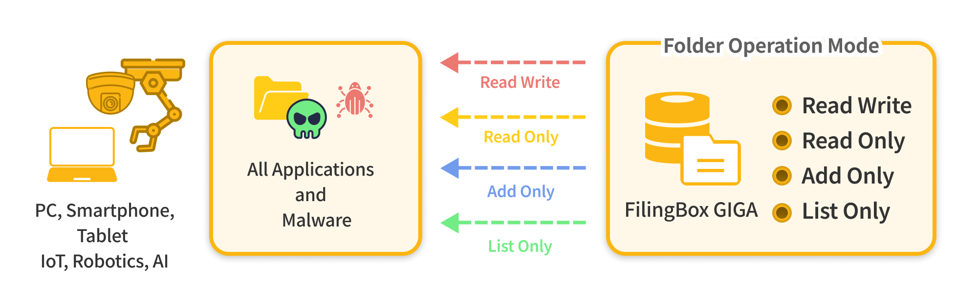 FilingBox GIGA is a network storage protection solution that protects the data of professionals managing large amounts of data or AI/OT/IoT devices generating sensitive data from ransomware and data theft malware using standard Samba file servers. Users can set the operation mode for folders to read/write mode, read-only mode, add-only mode, or list-only mode. When set to read/write mode, it allows both reading and writing like a regular storage device; however, when set to read-only mode, the folder operates in read-only mode, preventing file creation, modification, or deletion, allowing only viewing. When set to add-only mode, only new file creation is possible, and viewing, modifying, or deleting is not allowed. When set to list-only mode, the file list can be viewed, but not only is new file creation blocked, but viewing, modifying, and deleting of existing files is also prohibited.