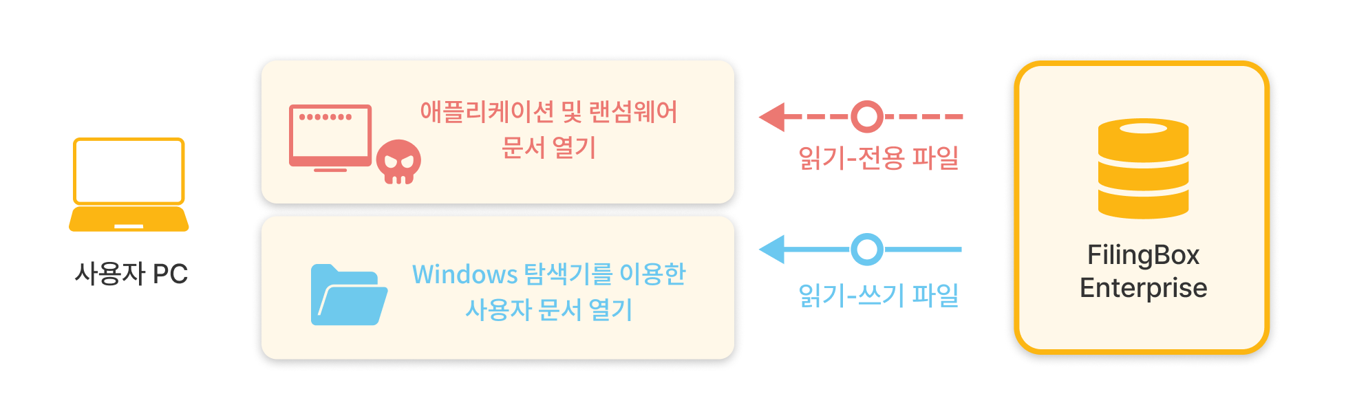 FilingBox Enterprise는 기업의 안전한 문서관리를 위한 스토리지 프로텍션 솔루션입니다. FilingBox Enterprise는 임직원 PC에 네트워크 드라이브를 제공하고, 조직 구조와 프로젝트팀에 따라 파일을 관리할 수 있는 조직 폴더와 프로젝트 폴더를 제공합니다. 또한 FilingBox에 보관 중인 파일에 대해 열람 요청이 들어오면, 읽기 전용 속성의 파일로만 제공하고, 사전에 지정된 Windows 탐색기를 통한 사용자 지정 열기 방식으로 파일 열기을 시도했을 경우에만 편집이 가능한 읽기 쓰기 속성의 파일을 제공합니다. 따라서 임직원 PC에서 랜섬웨어가 구동하더라도 FilingBox 내 업무 문서는 안전하게 보호됩니다.