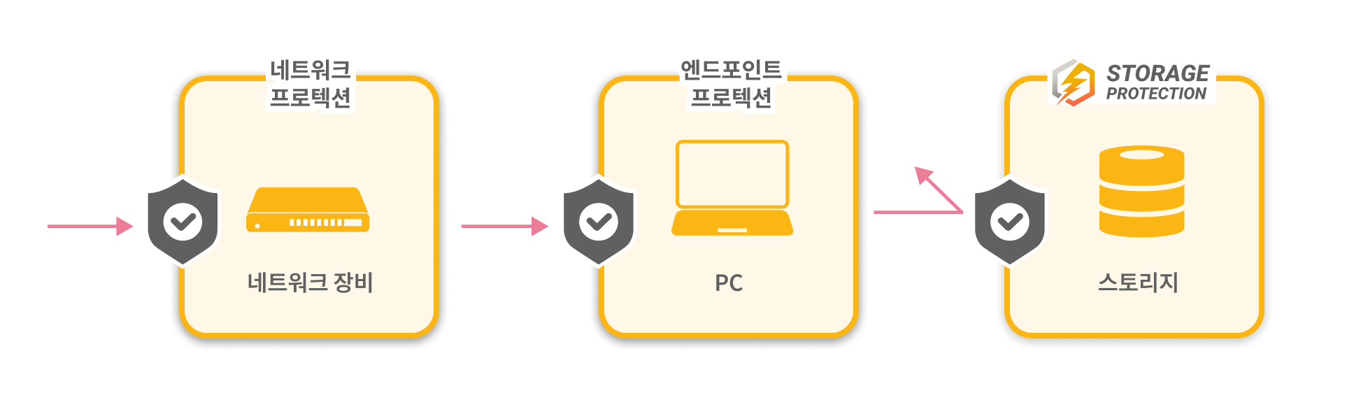 사용자 액션 레벨 스토리지 프로텍션 기술은 스토리지 관점에서 데이터를 보호하는 기술입니다. 종래 네트워크 프로텍션 및 엔드포인트 프로텍션에서 악성 요청을 검사하여 차단하듯이, 사용자 액션 레벨 스토리지 프로텍션 기술은 스토리지가 파일 열기를 요청하는 방식을 검사하여 사용자의 지정된 열기 방식(예: Windows 탐색기내 지정열기)에만 편집 가능한 읽기 쓰기 속성의 파일로 제공하고, 그 이외의 일반적인 파일 열기 요청에는 읽기 전용 속성의 파일을 제공합니다. 사용자 액션 레벨 스토리지 프로텍션은 파일별로 사용자 권한을 다르게 적용해야 하는 협업 업무 환경에 최적화되어 있습니다.